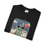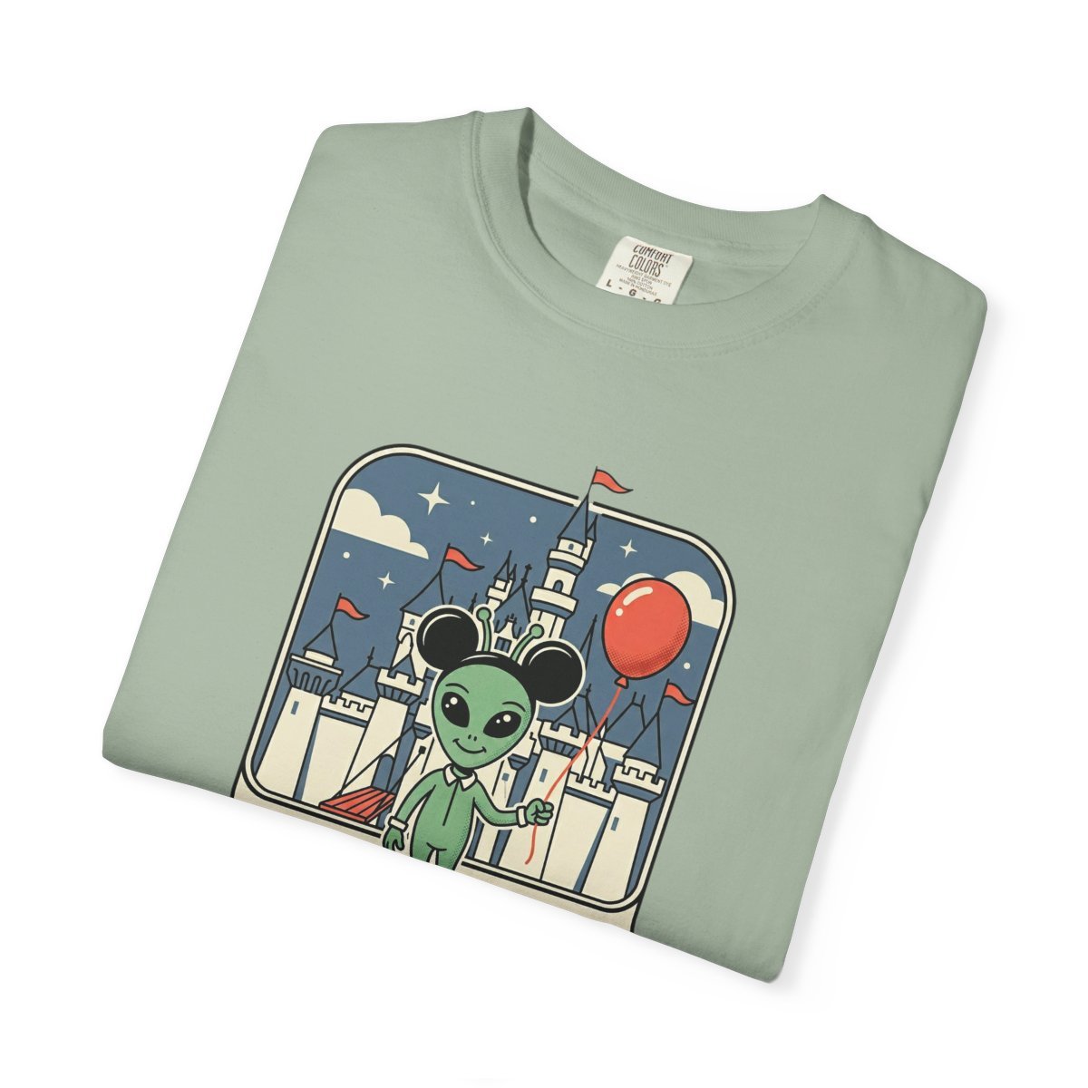 This heavyweight garment-dyed tee brings a quiet, playful kind of nostalgia. Softly faded color and a relaxed fit make it feel lived-in from the first wear. The front illustration—an earnest little alien standing before a storybook castle with a bright red balloon—reads like a memory captured on fabric: a whimsical mix of sci-fi curiosity and theme-park wonder. Wear it for slow weekends, road trips to offbeat attractions, or nights spent swapping strange stories around a fire. The roomy cut layers easily over a long-sleeve or stands alone as a comfortable statement piece for anyone who loves subtle, quirky art and the tactile, broken-in feel of garment-dyed cotton.
