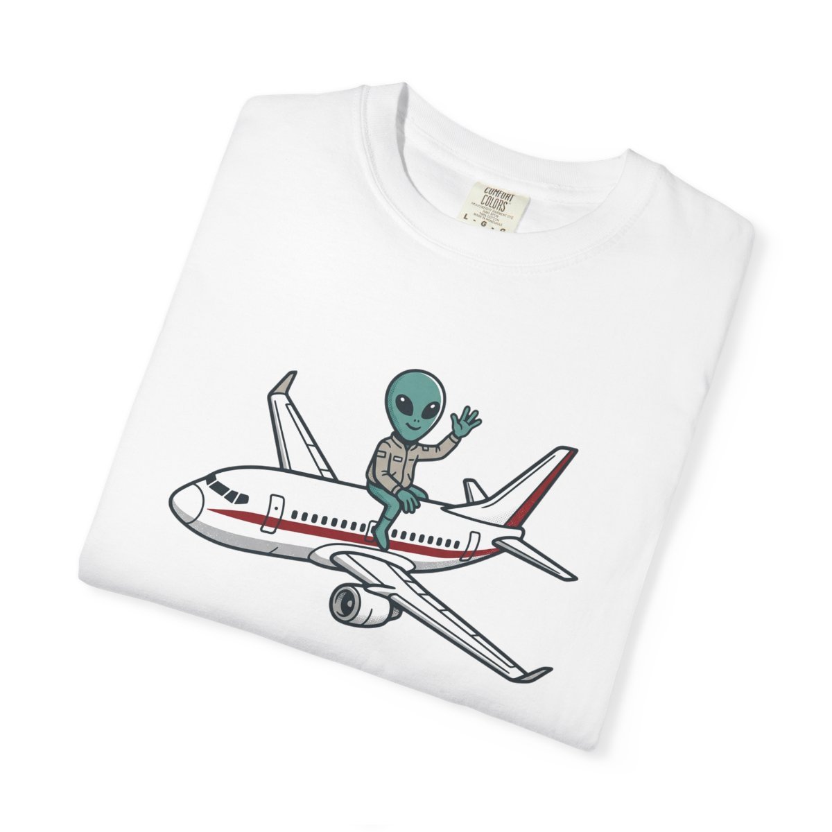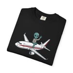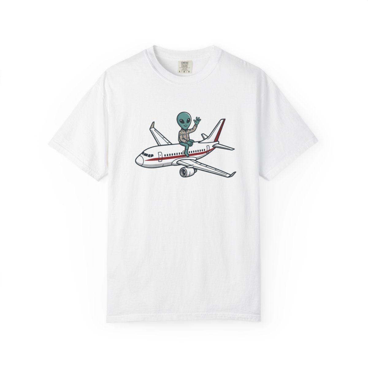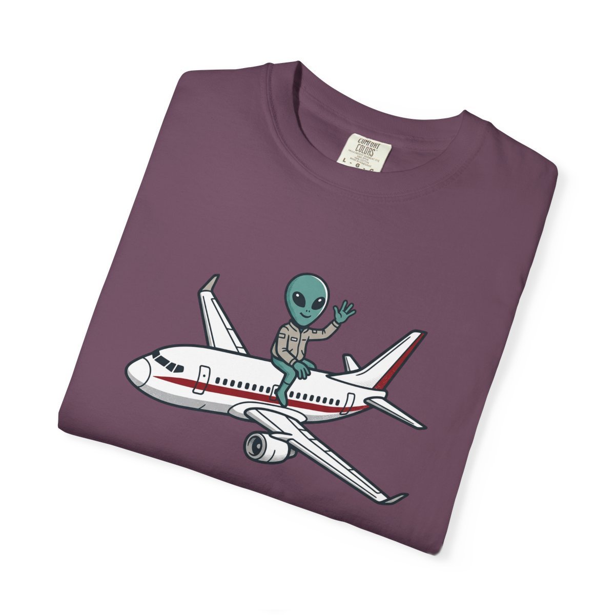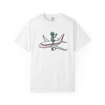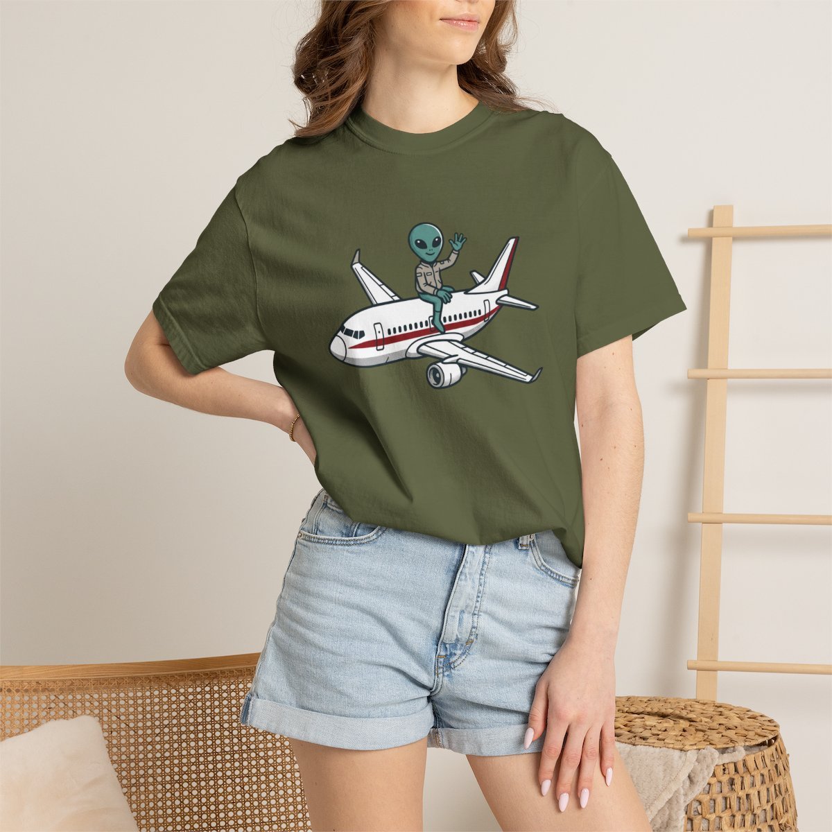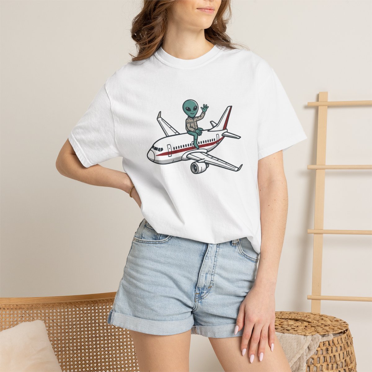 Lightweight mischief and quiet comfort meet on a shirt that feels lived-in from the first wear. This garment-dyed cotton tee carries a playful illustration of a small green alien perched atop a vintage airliner — a little wink to wanderers who like their travel with a side of cosmic humor. The fabric is soft and substantial, the relaxed fit drapes easily over layers, and the muted, washed-in color gives every piece a singular, broken-in character. Wear it on travel days, casual meetups, or lazy weekends when you want something easy, familiar, and a touch unexpected.
