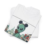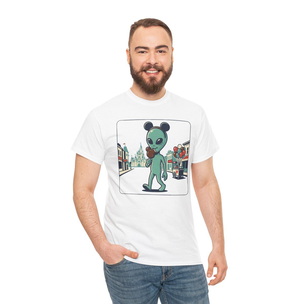 A relaxed, retro-inspired tee that tells a small, strange story: a wide-eyed green visitor strolls down a nostalgic main street, wearing mouse ears and a cluster of bright balloons. The image feels playful and slightly surreal — equal parts amusement park memory and late-night sci-fi sketch. The soft white canvas keeps the art crisp while the medium-weight cotton holds structure for a laid-back silhouette that layers easily. Wear it on casual city walks, weekend meetups, or when you want to add a hint of quirky wonder to an ordinary day.