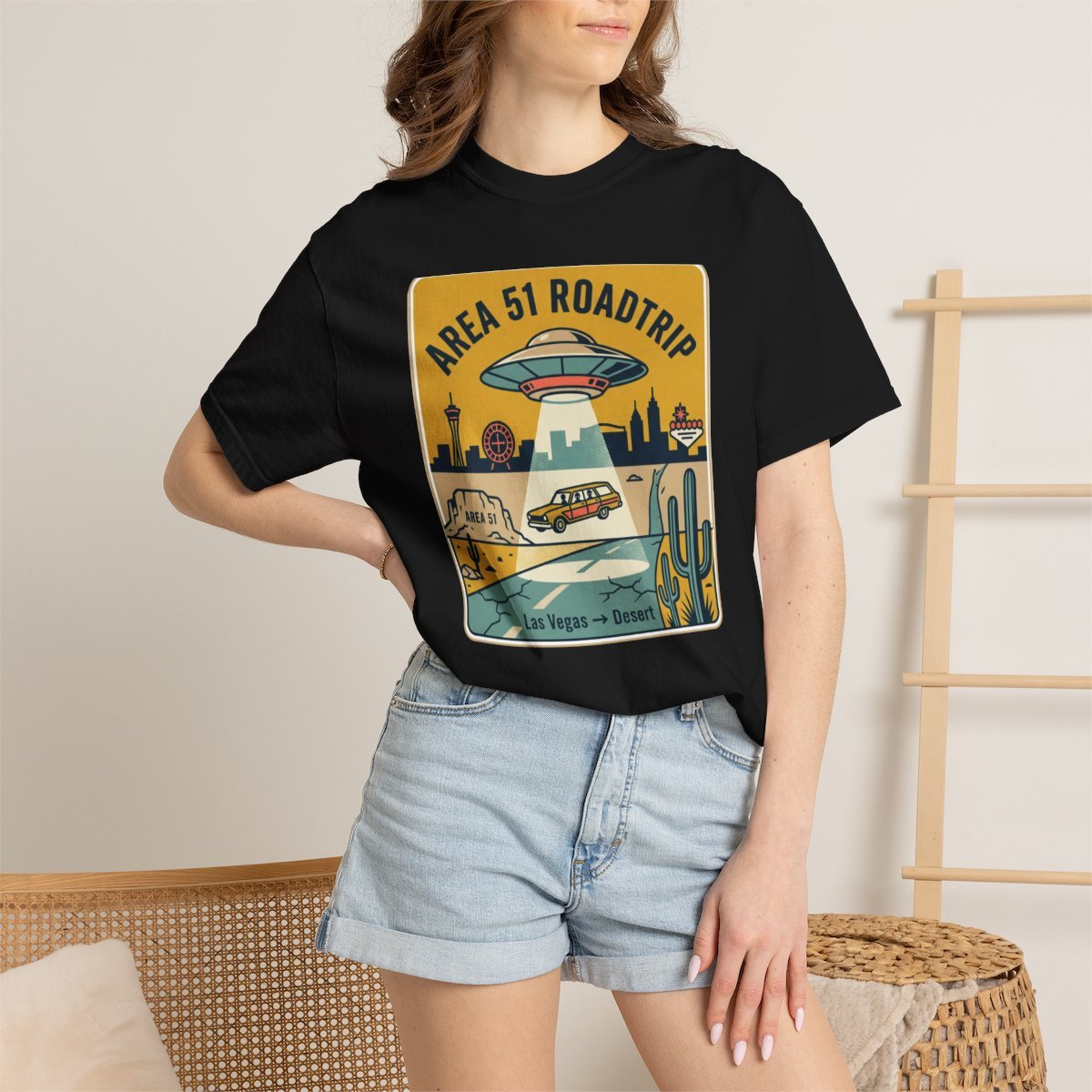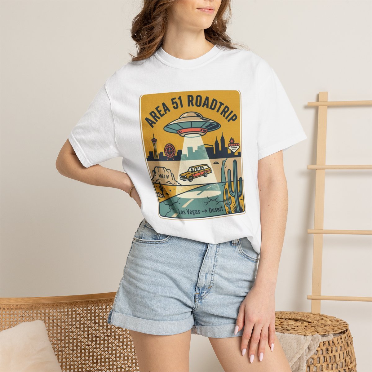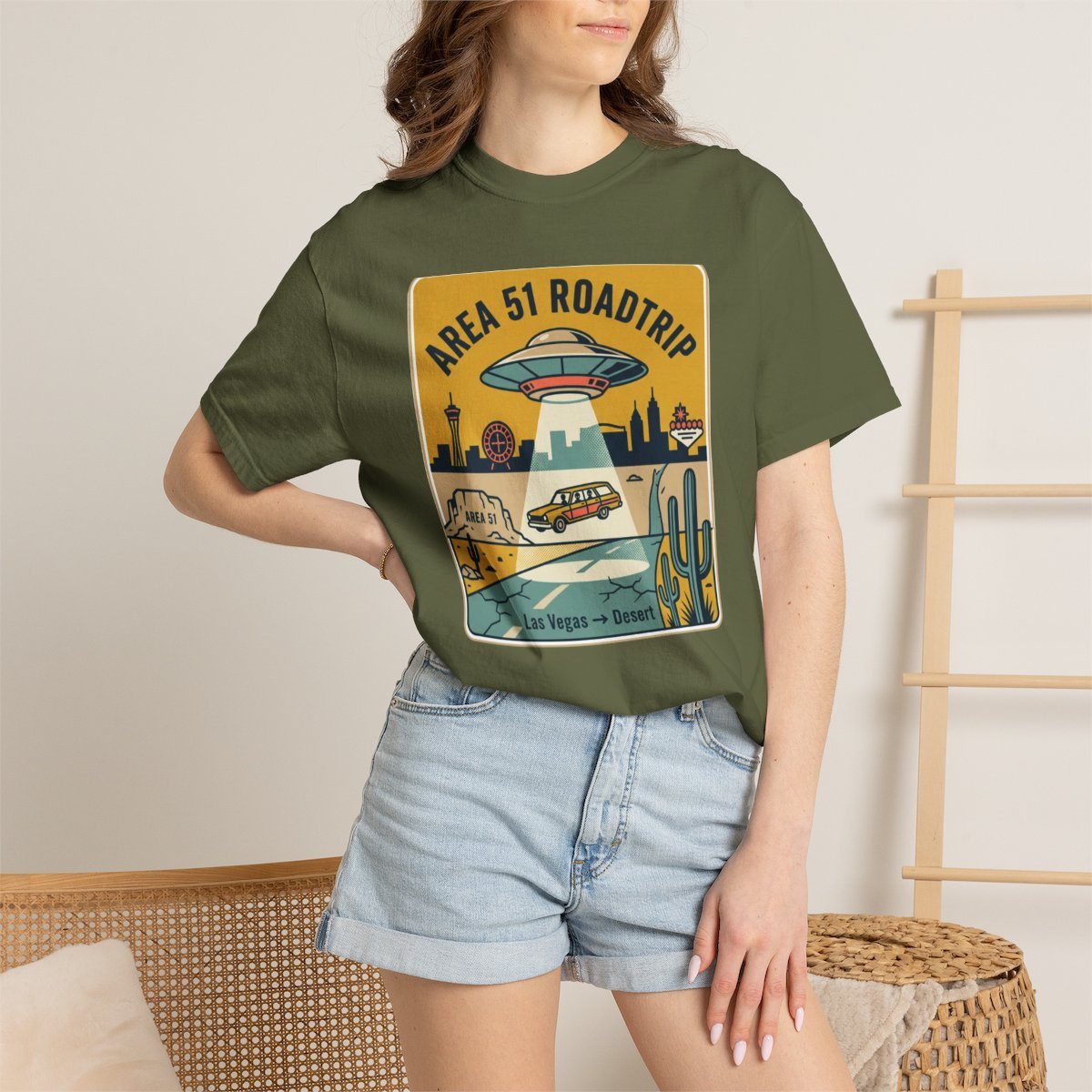 This relaxed, garment-dyed tee channels dusty desert sunsets and late-night road-trip lore. A vintage-inspired “Area 51 Roadtrip” print sits centered on soft, heavyweight cotton that feels broken-in from the first wear. It settles into the shoulders and hangs with an easy silhouette — the kind you grab when you're loading the car, hitting the highway, and chasing neon horizons. The muted, washed color palette and soft texture make the graphic feel lived-in, like a postcard from a quirky, offbeat adventure. Wear it to camp outside a small-town diner, to a desert meetup, or around town when you want a casual piece that tells a story without shouting.