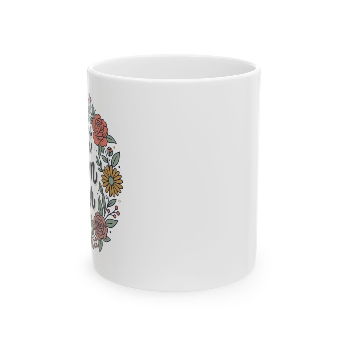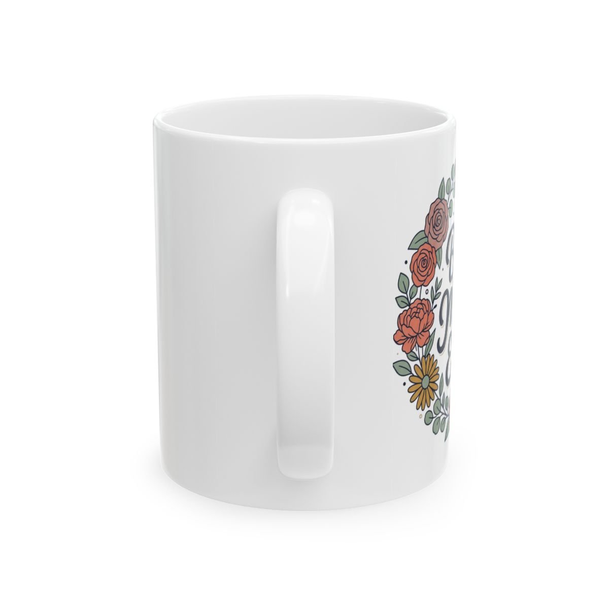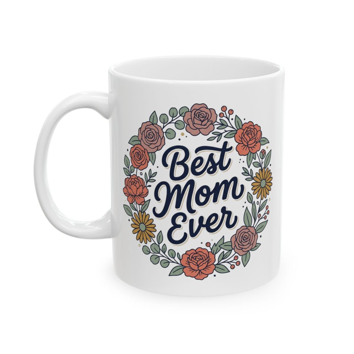 A warm, hand-lettered mug that says “Best Mom Ever” framed by a soft floral wreath. The glossy white ceramic surface makes the deep navy script and muted peach, coral and yellow blooms pop — a gentle, everyday reminder of appreciation. It sits comfortably in hand with a classic C-handle and is sturdy enough for daily coffee, tea, or cocoa. Use it on slow mornings, at the home office, or tucked into a cozy breakfast nook where small, quiet moments become meaningful.