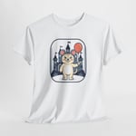 Soft, breathable cotton meets playful illustration. This tee features a cheerful cat holding a red balloon in front of a storybook castle — a quiet, whimsical scene that feels like a page from a midnight fairytale. The medium-weight fabric drapes casually, the crewneck keeps the silhouette classic, and the tubular knit construction gives a clean, seam-free look. Wear it on slow weekends, to casual meetups, or layered under a jacket for a relaxed, nostalgic vibe. The print blends crisp DTF details on small areas with smooth DTG coverage across the main image, so the artwork stays vivid wash after wash.