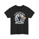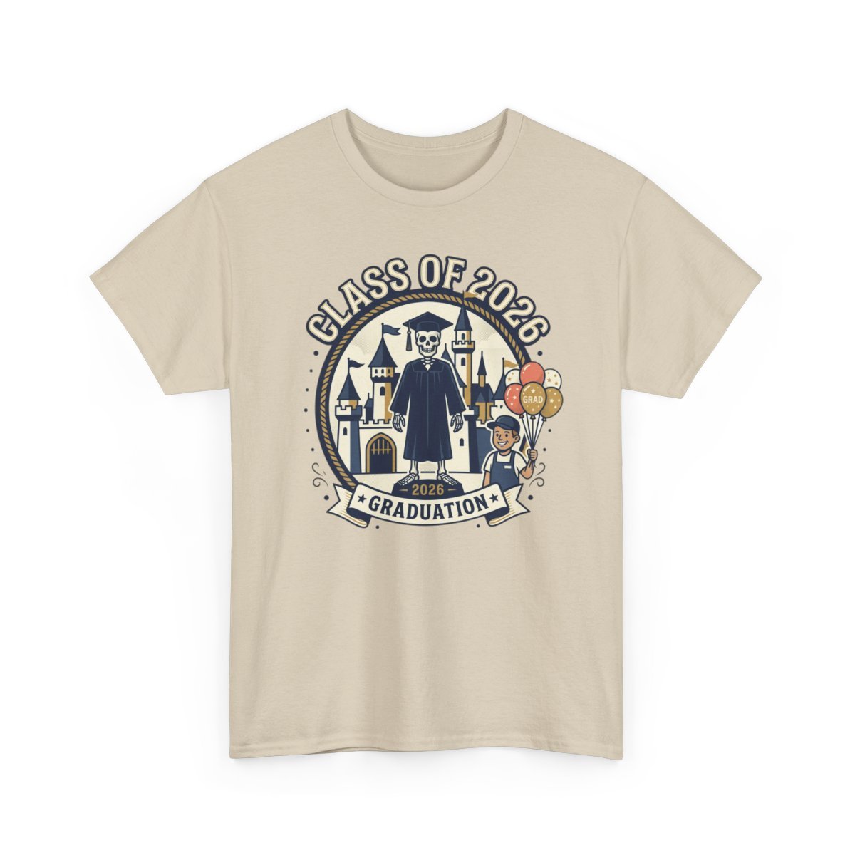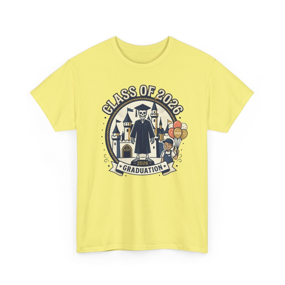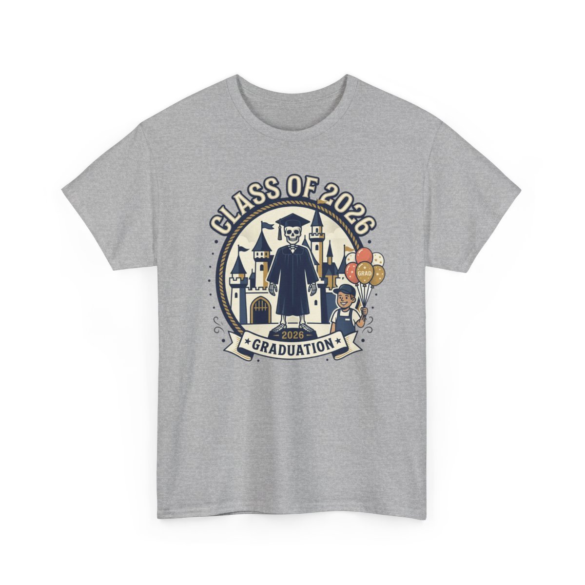 Celebrate milestone moments with a soft, reliable tee made for remembering the day. This classic crewneck carries a cheerful graduation illustration—caps, gowns, a smiling grad with balloons and a heraldic backdrop—printed with crisp detail so the artwork stays vibrant wear after wear. The comfortable, midweight cotton holds its shape, the tear-away label keeps things comfortable, and durable construction means it’s ready for photos, after-parties, and casual everyday wear. Wear it to walk across the stage, to family gatherings that follow, or tuck it away as a wearable keepsake that brings the ceremony back to life.