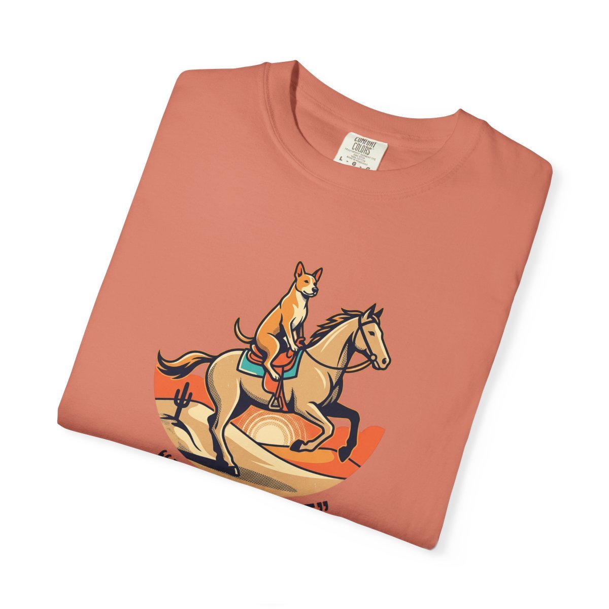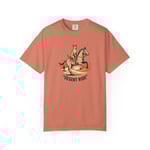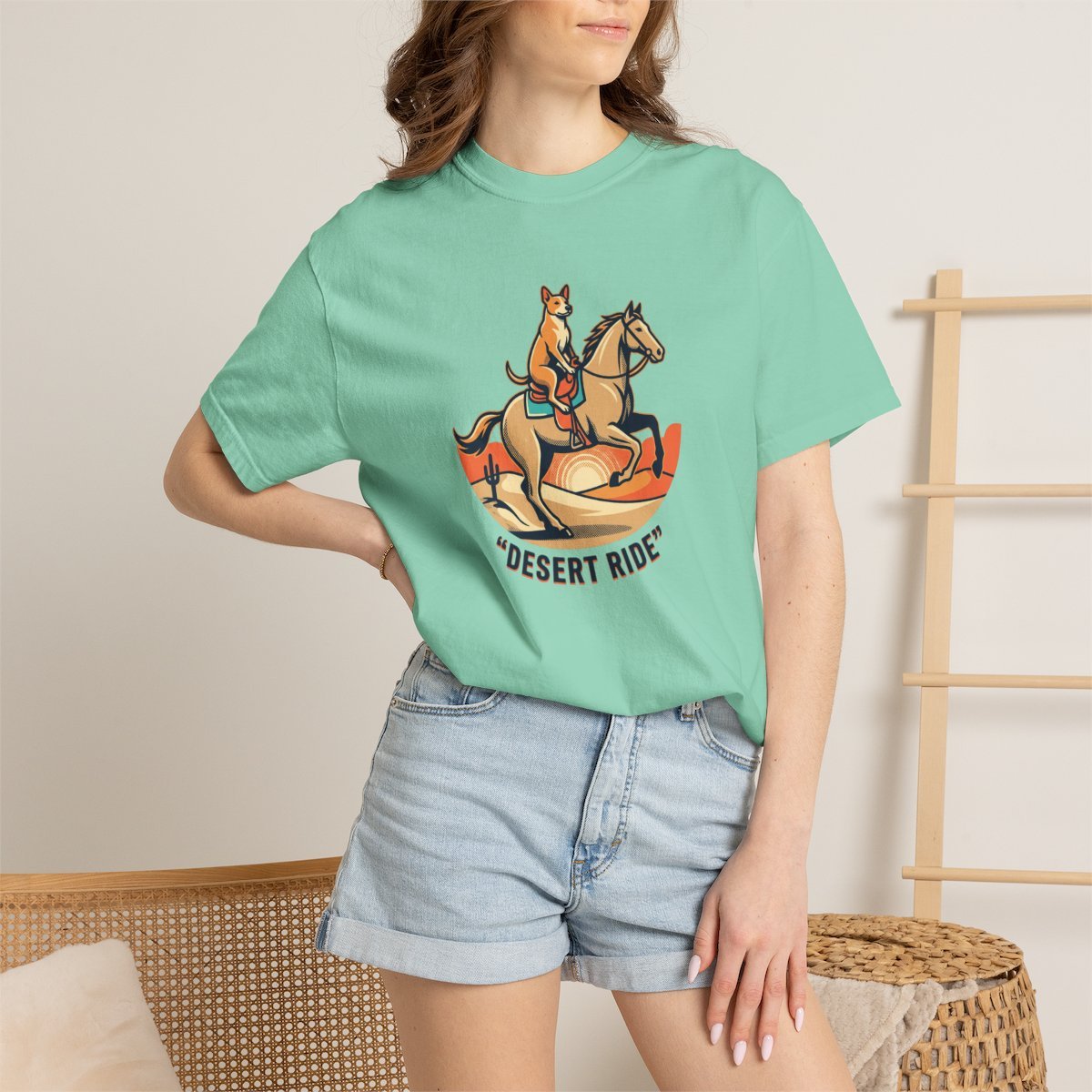 Sink into that slow, sun-warmed afternoon with this garment-dyed tee. The relaxed fit and heavyweight cotton hold shape while feeling lived-in soft, like a favorite shirt you reach for when you want comfort and a little nostalgia. The vintage-style Desert Ride illustration—a lone rider and horse against low dunes and a warm horizon—calls up road trips, dusty trails, and evenings where the air tastes like campfire and citrus. Wear it to lean into easy weekends, to layer under a flannel on cool mornings, or to carry a quiet, adventurous mood to small gatherings and open-road days.