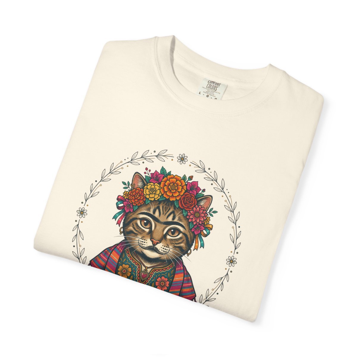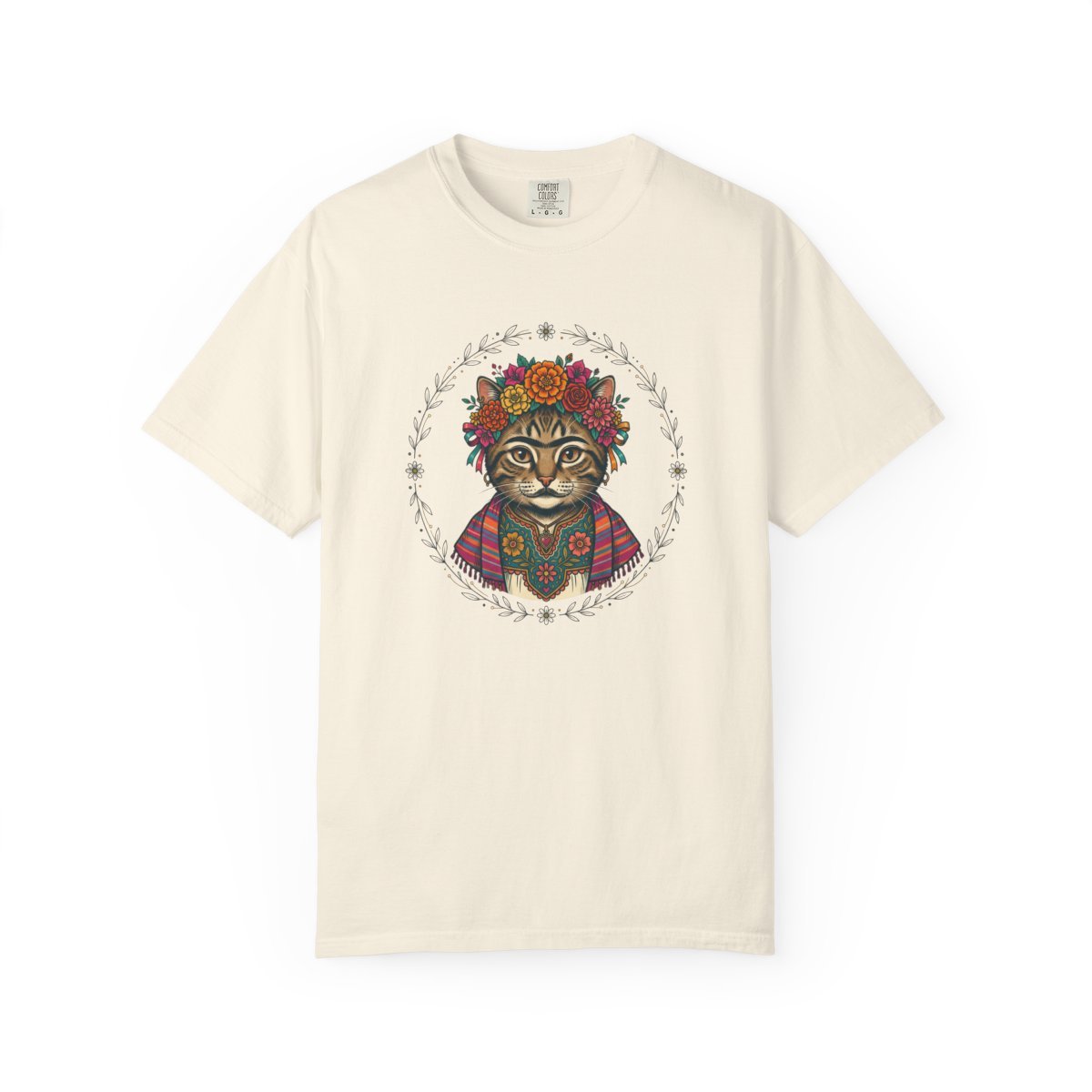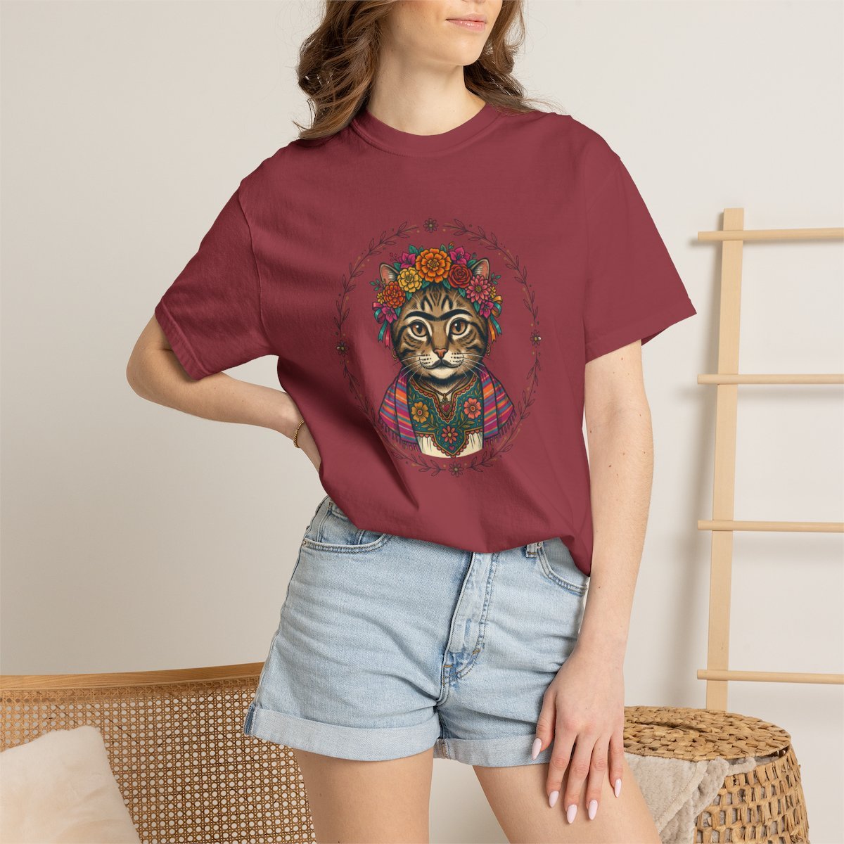 This relaxed, garment-dyed tee carries a warm, handcrafted vibe—soft to the touch with a lived-in color that deepens after every wash. The front features a detailed, folk-art inspired cat portrait framed by delicate laurel sprigs; rich florals and woven-pattern accents give it a cozy, artisanal energy. Wear it on slow mornings with coffee, at local craft markets, or layered under a flannel for strolls through leafy streets. The heavyweight knit and relaxed cut create a comfortable silhouette that feels like an old favorite from the very first wear.