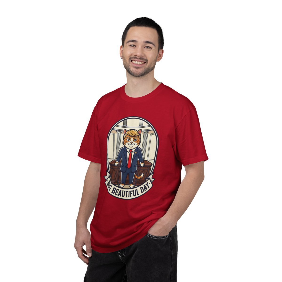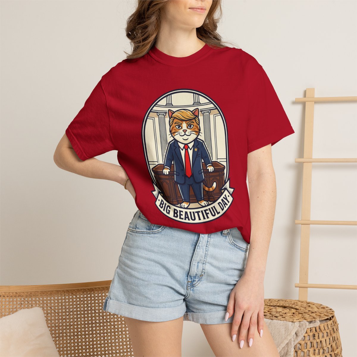Graphic T-Shirt — 'Big Beautiful Day' Cartoon Suit Cat Tee
