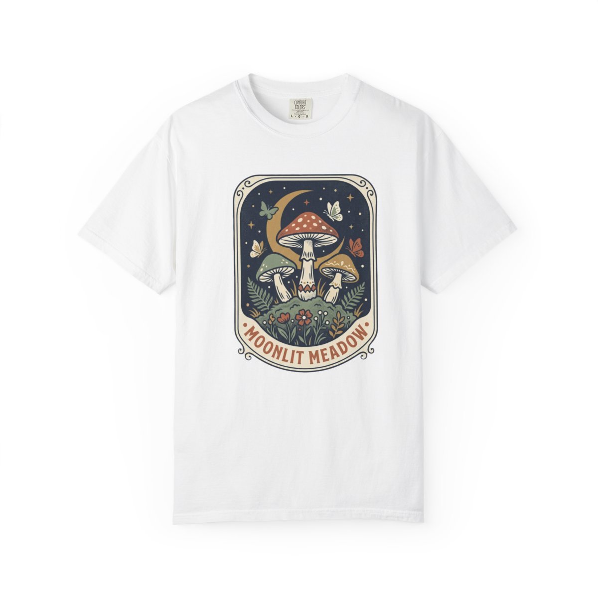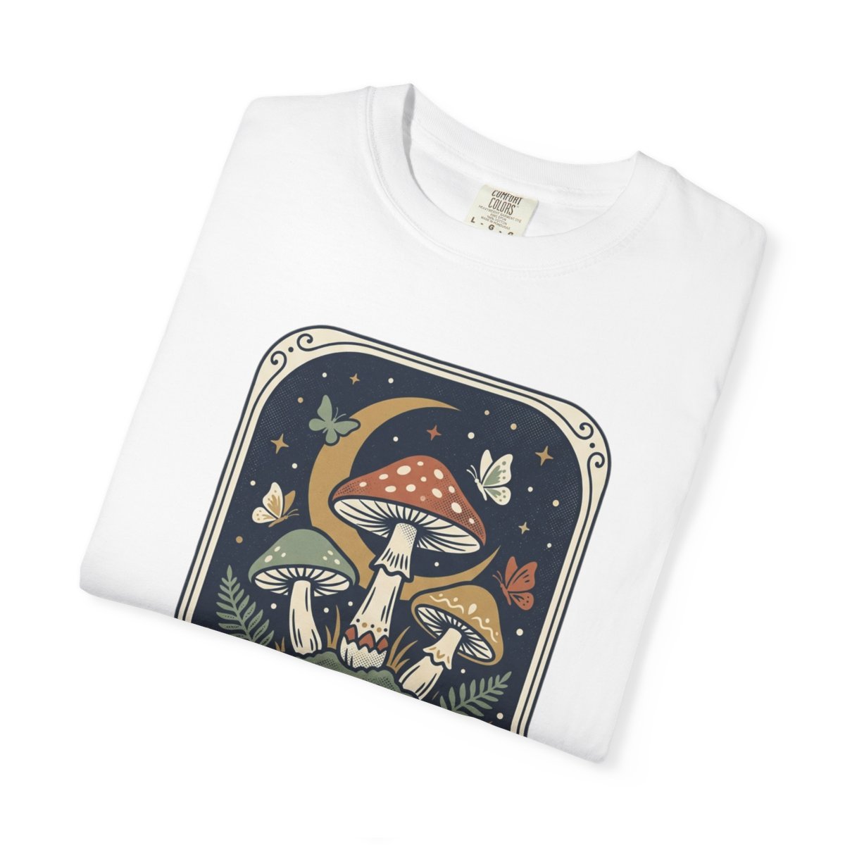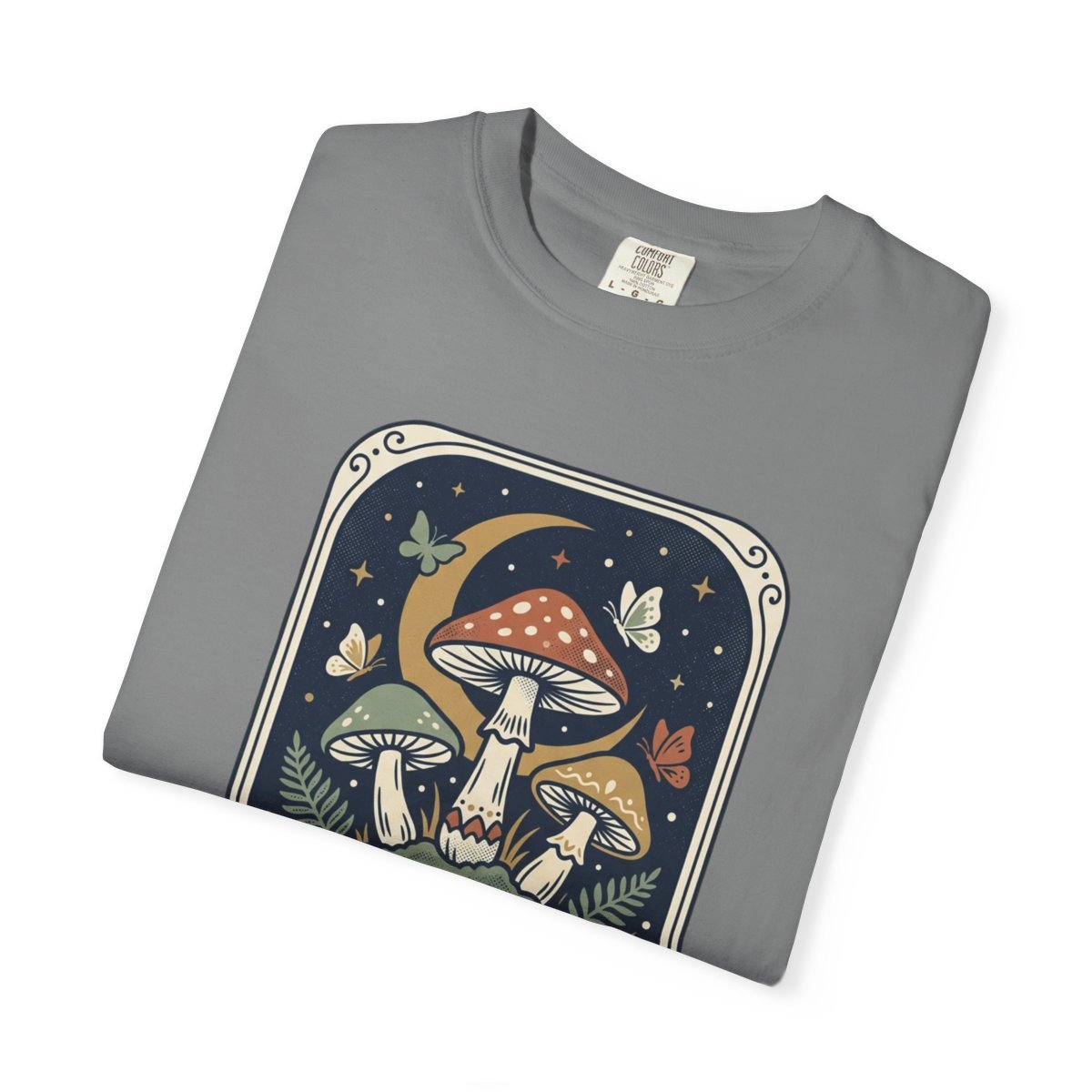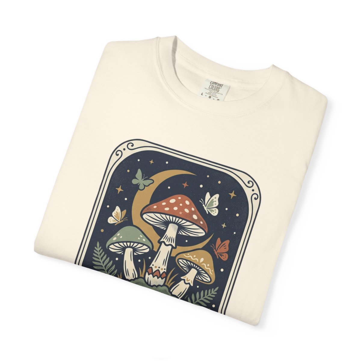 Soft, lived-in tee with a hand-dyed feel and a whimsical woodland print. The heavyweight, garment-dyed cotton drapes with a relaxed fit and gentle vintage wash that gets better with each wear. On the front, a moonlit mushroom illustration—tiny moths, ferns, and a warm night sky—reads like a quiet campsite memory. It’s the kind of shirt you pull on for evening walks, slow coffee on the porch, or low-key outdoor gatherings when you want comfort and a little story on your chest. Durable double-needle stitching and a tubular, seam-free body give it a clean silhouette while the sewn-in label keeps the neckline soft. Available in many colors and sizes, this tee blends rustic charm and everyday toughness so it feels familiar from the first wear.