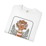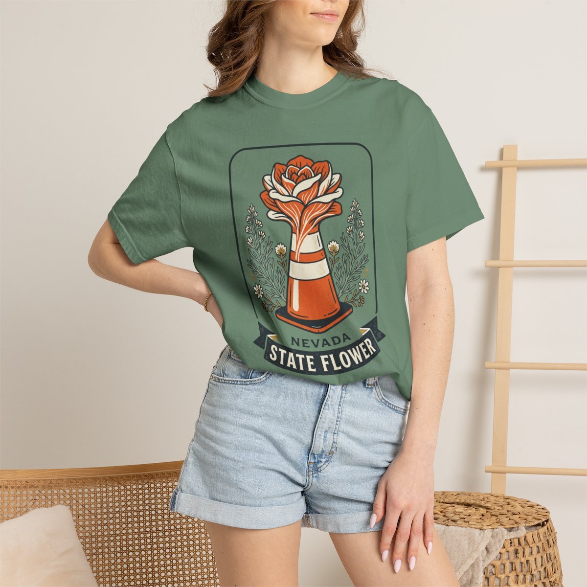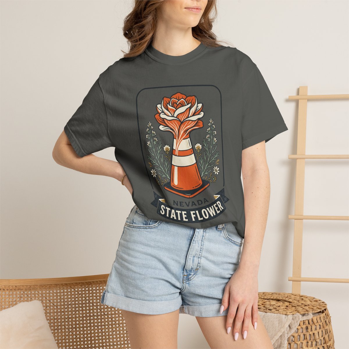 Soft, lived-in cotton meets a hand-drawn emblem of Nevada pride. This garment-dyed tee feels like an old favorite from the first wear — slightly heavy, pleasantly broken-in, and cut with a relaxed silhouette that layers easily over hoodies or slips under a jacket. The front art frames a stylized state flower rising from a vintage badge, finished with leafy accents and a bold banner that reads “Nevada State Flower.” It reads like a small, wearable poster for road trips, state fairs, and backyard bonfires. Wear it when you’re tracing highway routes, pulling up a lawn chair at a community festival, or simply reaching for something comfortable that still says where you belong.