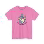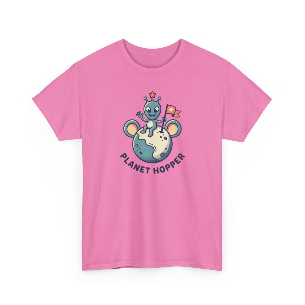 Soft, slightly oversized, and printed with a playful space-cartoon, this tee brings a lighthearted spark to everyday wear. The front shows a cheerful alien mascot perched on a tiny planet, flag in hand, with ‘Planet Hopper’ beneath—cute, colorful, and a little mischievous. The medium-weight cotton holds shape and color through repeated washes while the tear-away label and ribbed collar keep comfort top of mind. Wear it on relaxed days, at meetups with fellow sci-fi fans, or when you want something that reads friendly and fun without trying too hard.