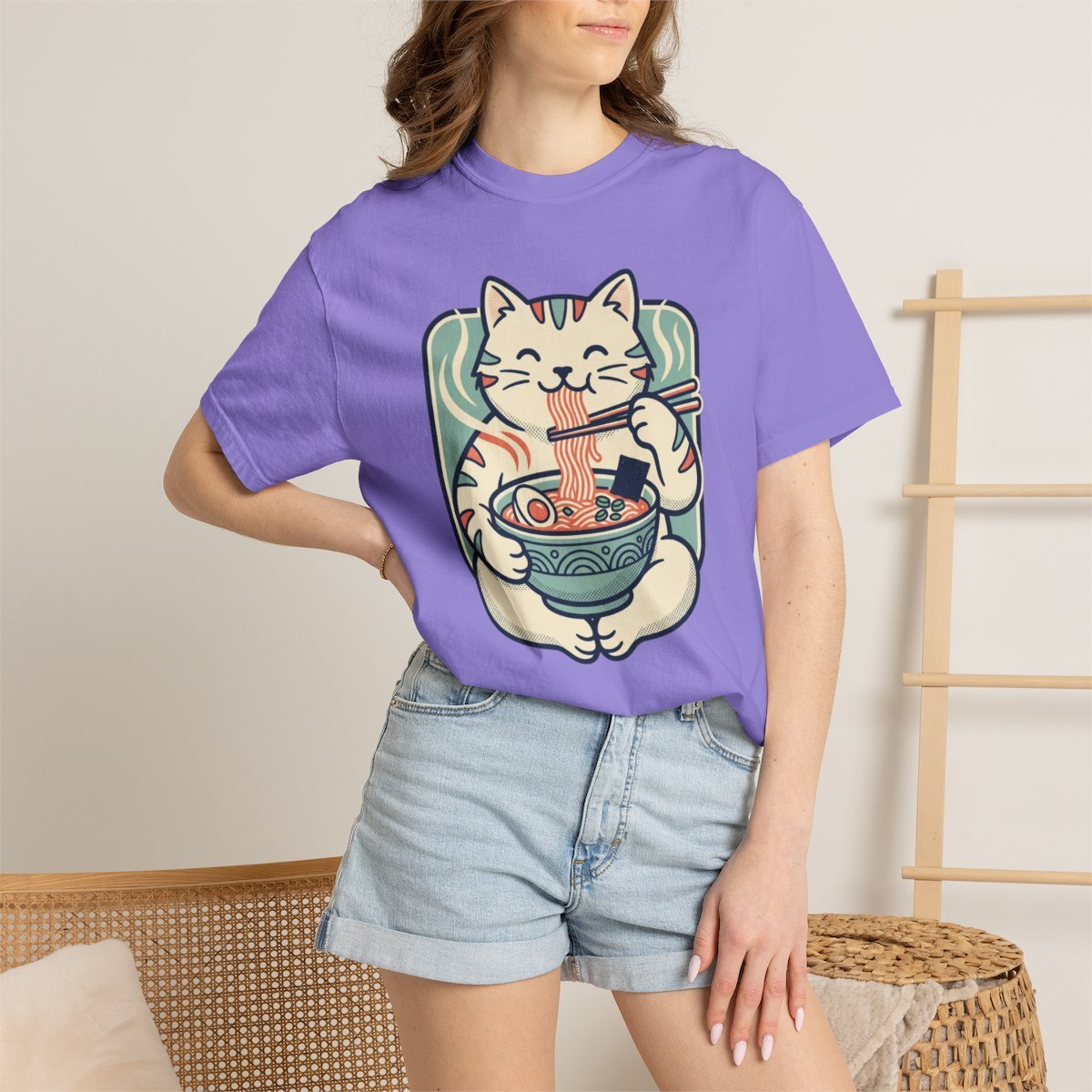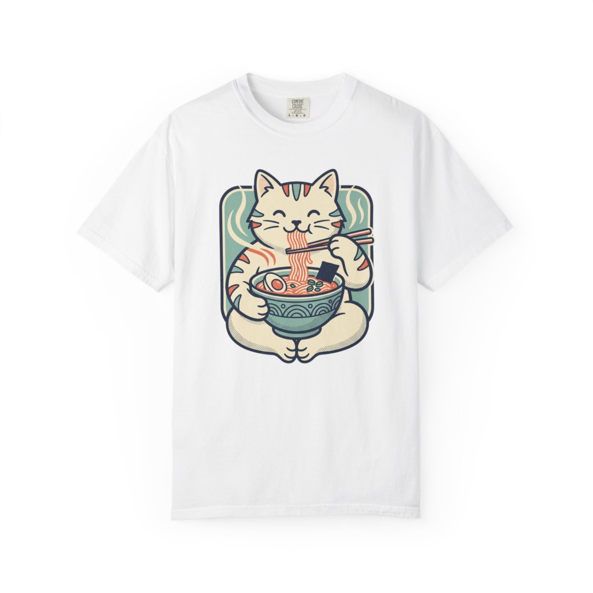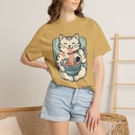 Soft, worn-in cotton meets cozy charm. This garment-dyed tee carries a relaxed, lived-in feel that invites slow mornings and noodle-soup nights. A cheerful maneki-neko cat cradles a steaming bowl of ramen across the chest — playful, warm, and quietly joyful. It sits well with a stack of sketchbooks, a steaming mug, or a evening spent with friends sharing stories and bowls. The heavyweight knit and subtle faded color give the print a handcrafted, vintage vibe that blends with streetwear and home-comfort wardrobes alike.