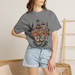 Salt spray, anchor lines, and late-night yarns—this relaxed garment-dyed tee carries the look of old sailor flash with soft, worn-in color and a heavyweight feel. An anchor and banner reading “Sea Stories” sits amid swallows, a dagger, and rolling waves—art that reads like a logbook sketched under a lantern. The heavyweight cotton softens with wear and wash, draping easily over a flannel or under a peacoat. Wear it on deck, at the harbor bar, or while swapping tall tales by a bonfire. It’s for people who collect voyages, not trophies—and want clothing that already looks like a favorite.